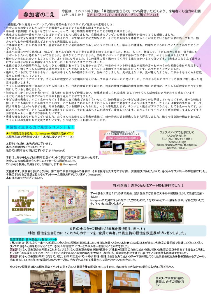 10月5日、日本教育会館一ツ橋ホール(東京・千代田区)にて「特性・個性を生きる力に」をテーマに開催。さくらんぼ教室生徒・保護者の他、学校の先生、医療機関などの関係各機関700名に来場いただきました!